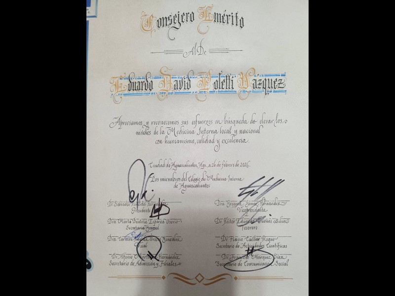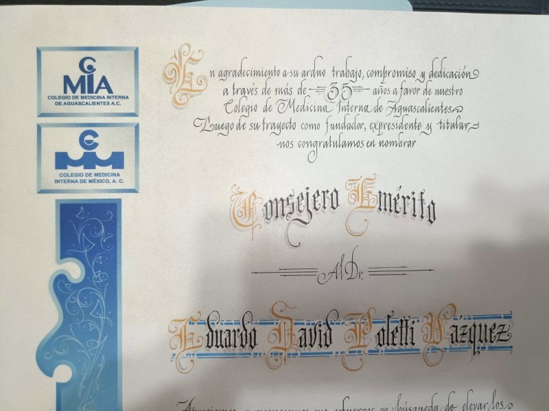 Estos merecidos reconocimientos fueron por el trabajo, compromiso y dedicación a traves de sus 35 años a favor del Colegio de medicina Interna de Aguascalientes como fundador, expresidente y titular dice uno de los pergaminos entregados al galeno. Que orgullo estimado Doctor Poletti, que seas nombrado consejero Emérito Vitalicio.